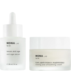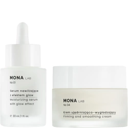 Jeśli zależy Ci na intensywnym ujędrnieniu, wygładzeniu i rozświetleniu skóry, idealnie sprawdzi się zestaw kosmetyków MONA LAB No 02. Wchodzące w skład zestawu serum nawilżające z efektem glow nawilży i rozświetli skórę i wyrówna jej naturalny odcień. Produkt nie tylko rozświetli cerę, ale także – dzięki wyciągowi z peruwiańskiej rośliny tara – zapewni odpowiedni poziom nawilżenia, zmniejszy szorstkość i suchość skóry, sprawiając, że będzie ona gładka. Natomiast krem ujędrniająco-wygładzający pogłębi i wzmocni działanie serum, dzięki czemu Twoja skóra zachowa jedwabistość na długo. Krem występuje także w duecie z serum anti-age – to MONA LAB No 03. Ten zestaw daje silny efekt odmładzający. Zapobiega wiotczeniu skóry, nadaje jej świeży wygląd i spłyca zmarszczki.