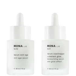 Skóra każdej z nas ma inne potrzeby i tempo starzenia. Zestaw kosmetyków MONA LAB No 01, składający się z serum anti-age i z serum nawilżającego z efektem glow, pozwoli Ci zregenerować i odmłodzić skórę. Kosmetyki mają właściwości wygładzające i ujędrniające. Działają przeciwzmarszczkowo, napinają i uelastyczniają skórę. Preparaty nawilżają i odżywiają suchą, matową i zmęczoną cerę, nadając jej zdrowego blasku. Dzięki naszym wyjątkowym produktom skóra stanie się jedwabista, miękka i delikatna.
